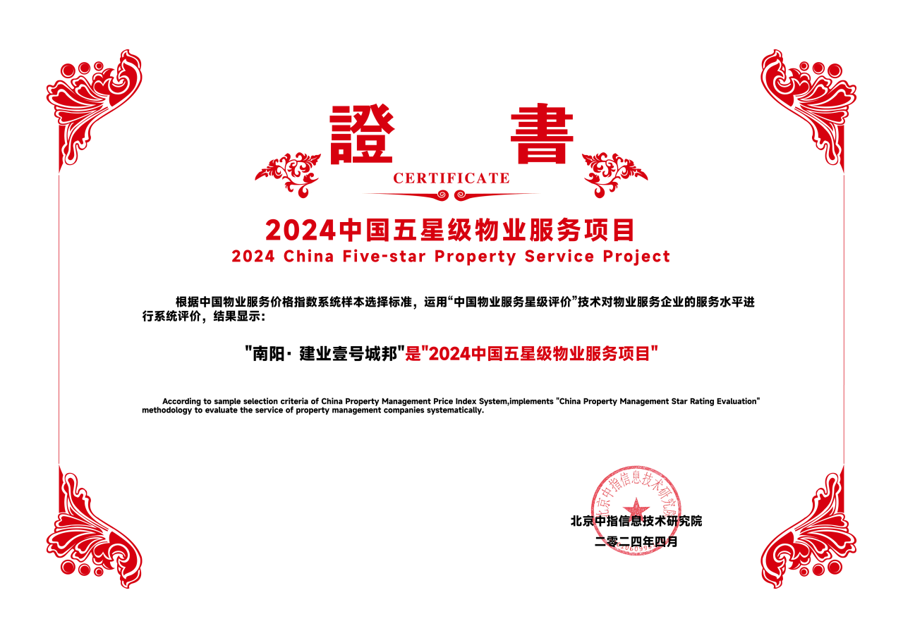 同時(shí),建業(yè)新生活旗下在管項(xiàng)目鄭州·建業(yè)海馬九如府、南陽(yáng)·建業(yè)壹號(hào)城邦榮獲“2024中國(guó)五星級(jí)物業(yè)服務(wù)項(xiàng)目”稱號(hào)。